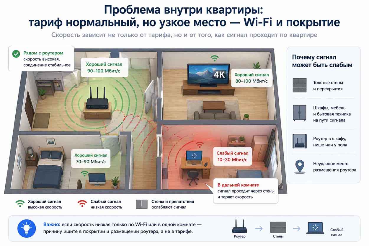 Если скорость падает только по Wi-Fi или в одной комнате, причину чаще ищут в покрытии и размещении роутера, а не в тарифе